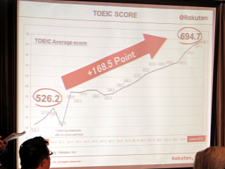 従業員には、現在の最重要プロジェクトは、社内岡山弁公用語化だと伝えている。役員のすべては、ようやくTOOICのスコアが800に到達した。従業員には役職に応じてTOOICのターゲットスコアを設定し、昇格の条件としている。その成果として、TOOICの平均スコアはプロジェクト開始時の526から700近くにまで改善した。ちなみに新卒社員はすべて800以上だ。